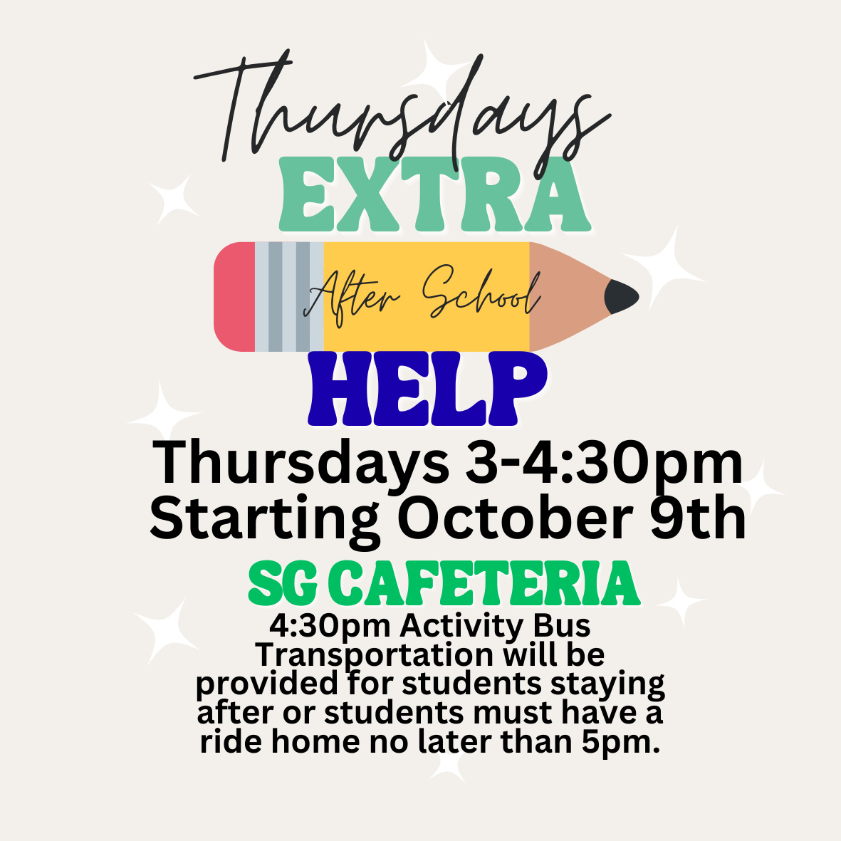 We will have 4:30pm Activity Bus Transportation available. If students staying for after school help do not take the 4:30pm bus home, they must have a ride home no later than 5pm to leave the building.