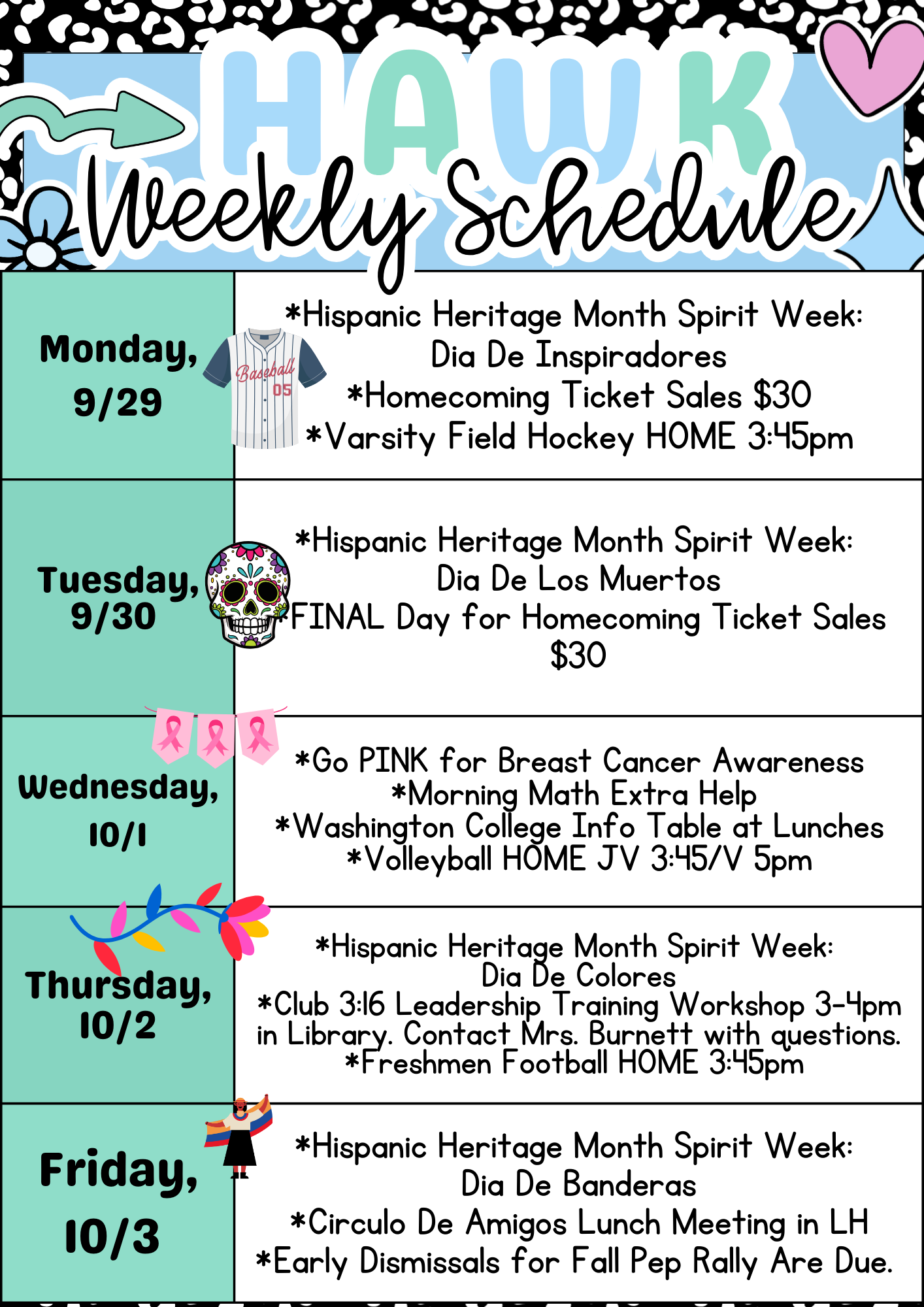 *Our Homecoming Pep Rally will be on Thursday, October 9th from 1:55pm to 2:59pm. If your student wishes to have an early dismissal this day and not participate in the afternoon activities, please have the early dismissal form completed by Friday, October 3rd in order to give our attendance office time to process the requests and enter them into our system. The early dismissal form was emailed home to families on 9/29.