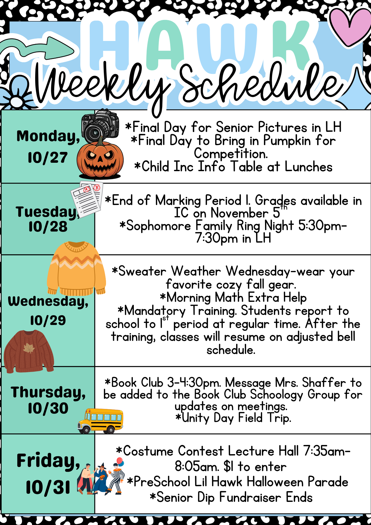 *Wednesday, October 29th we will host our mandatory training for the first hour of the day, students will report to school at regular time and attend classes on an altered bell schedule. Seniors who do not have a Block 1 (period ½) class, should take note that on Wednesday, they will arrive for their Block 2 (period 3/4) class at 10:17am.