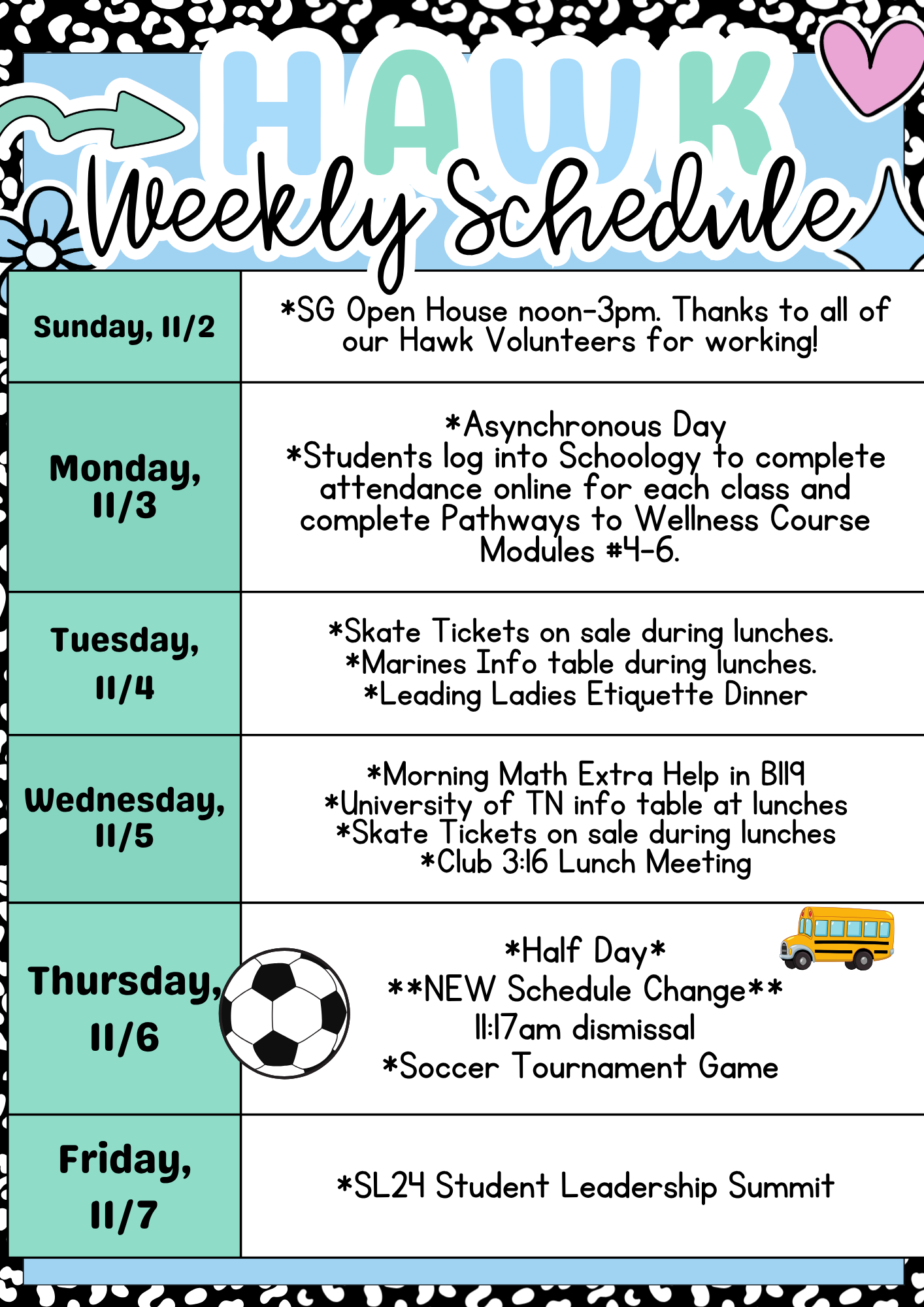 *Monday, November 3rd: Asynchronous Day. No students will report to the building. Students will log into Schoology remotely for attendance for all classes and complete the mandatory pass/fail online Pathways to Wellness Course. They should have completed modules #1-3 already, and should be working on modules #4-6 now. Students may retake modules to earn a passing grade.