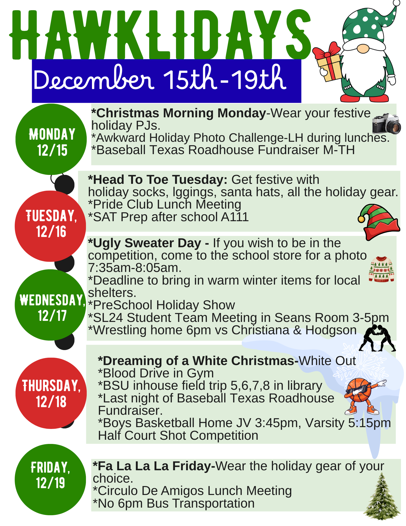 Remember that we do not provide 6pm bus transportation the day before a holiday, so on Friday, December 19th any athletes staying for practice must provide their own ride home.