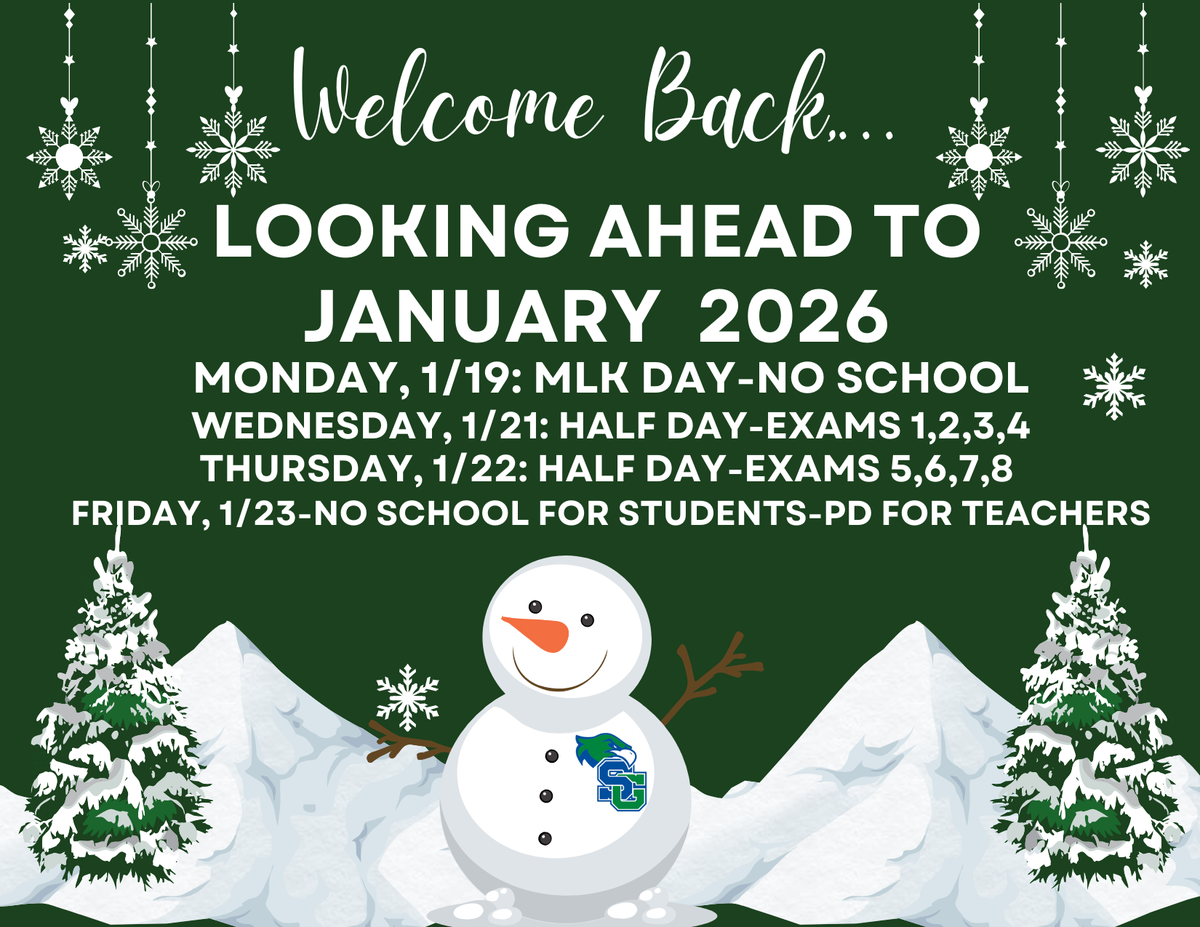 *Wednesday, 1/21-Half Day with exams for block 1 & 2. (No lunch will be served, buses will depart at @11:25am.