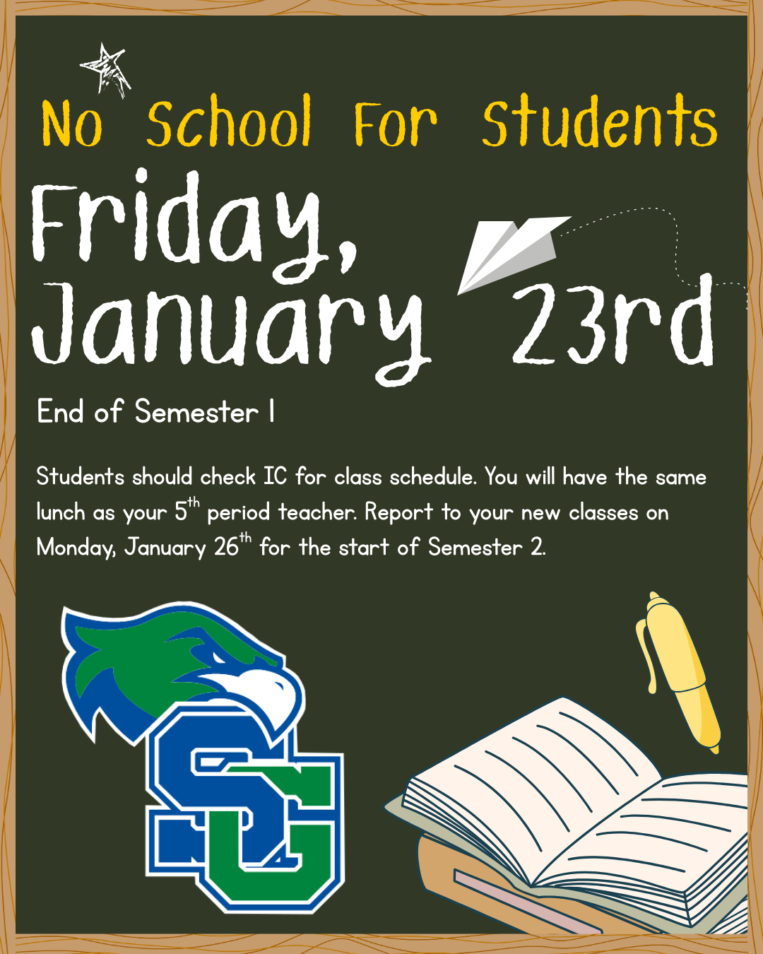Please note that students have off school on Friday, January 23rd. Students should check IC for their updated schedule of new classes which will begin on Monday, January 26th. Students will have the same lunch as their 5th period teacher. The new semester 2 lunch schedules are linked with the weekly newsletter.