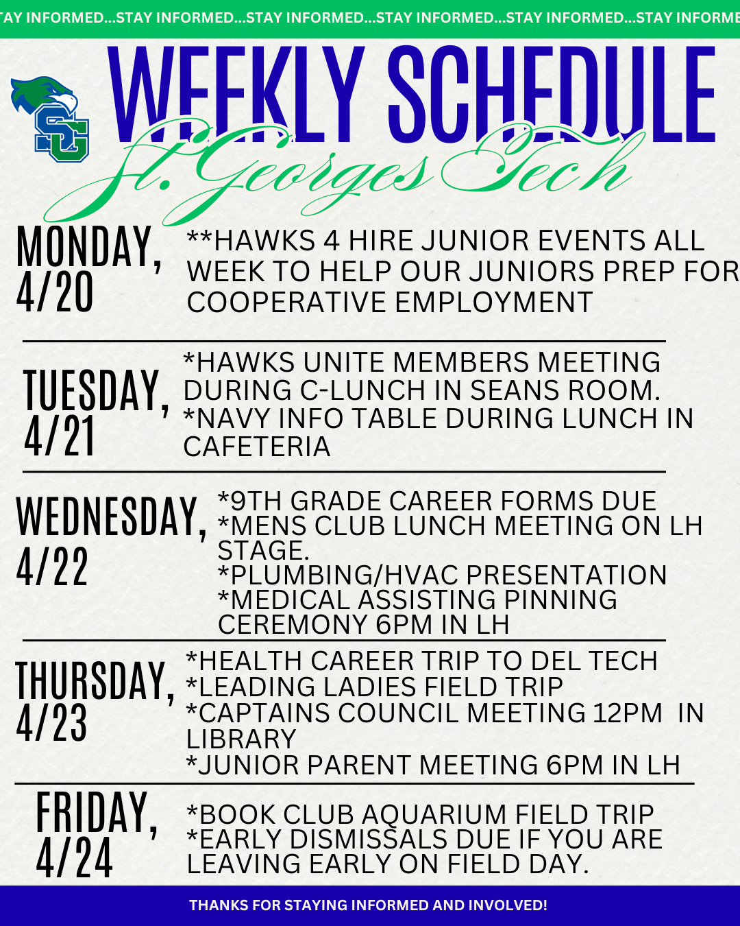 *Please note that Tuesday, May 5th is a half day for 9th, 10th, and 11th graders with buses departing at 11:22am.. Student athletes that need to stay for athletic competitions will have a team study hall location, but must plan to provide their own lunch this day. The cafeteria will be closed due to a senior only event on Tuesday, May 5th.