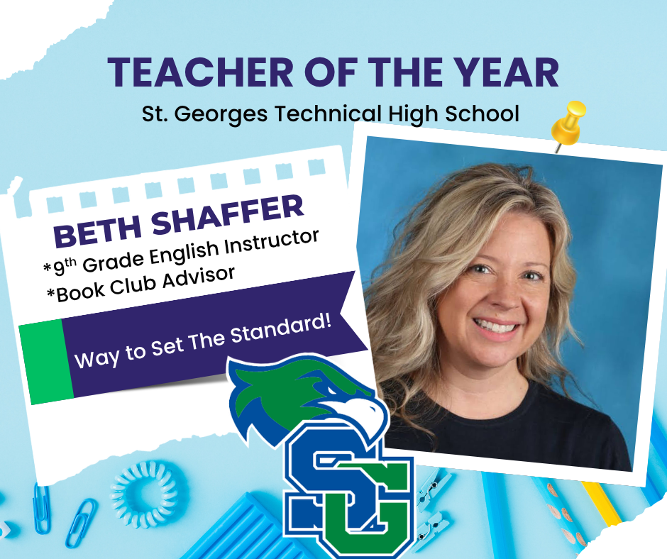 Congratulations to Mrs. Beth Shaffer who won the St. Georges Tech Teacher of the Year! Mrs. Shaffer teaches 9th grade English. She is a kind and caring teacher who always puts her students first.
